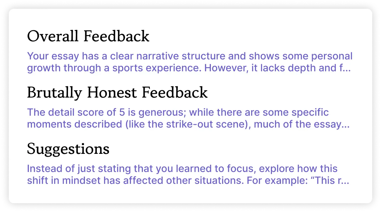 Letting AI write large parts of your essay can make it sound generic and less personal. The goal is to use college essay checkers to strengthen your writing, not replace your thinking or your voice.